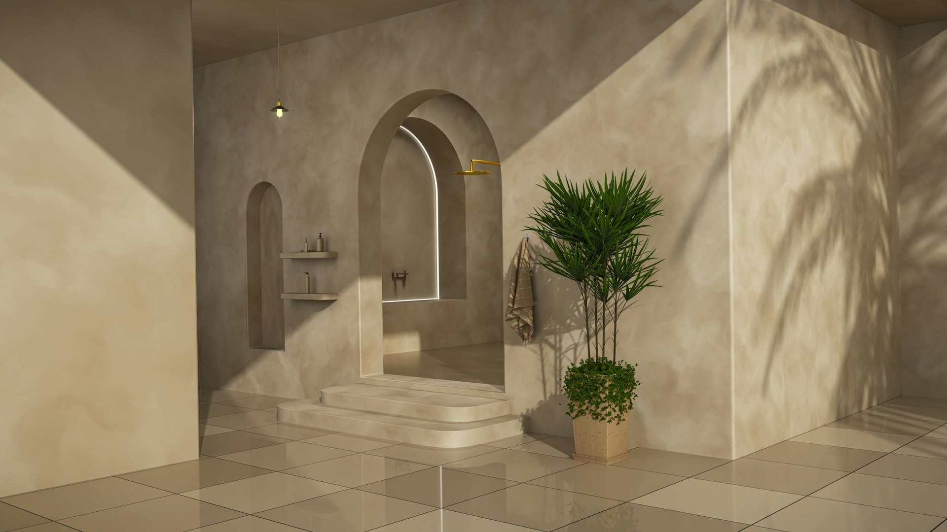 A quiet procession of columns and a sculptural centerpiece guide the eye toward framed views. Warm plaster walls and soft daylight create a setting of contemplative elegance.