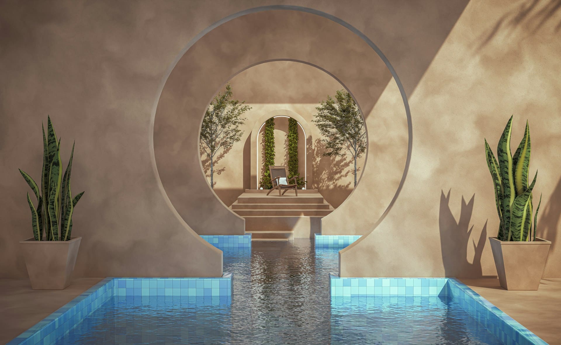 Soft stucco walls, a lone palm, and an open sky bring elemental simplicity. The still surface of the pool becomes both mirror and threshold, blurring enclosure and openness.